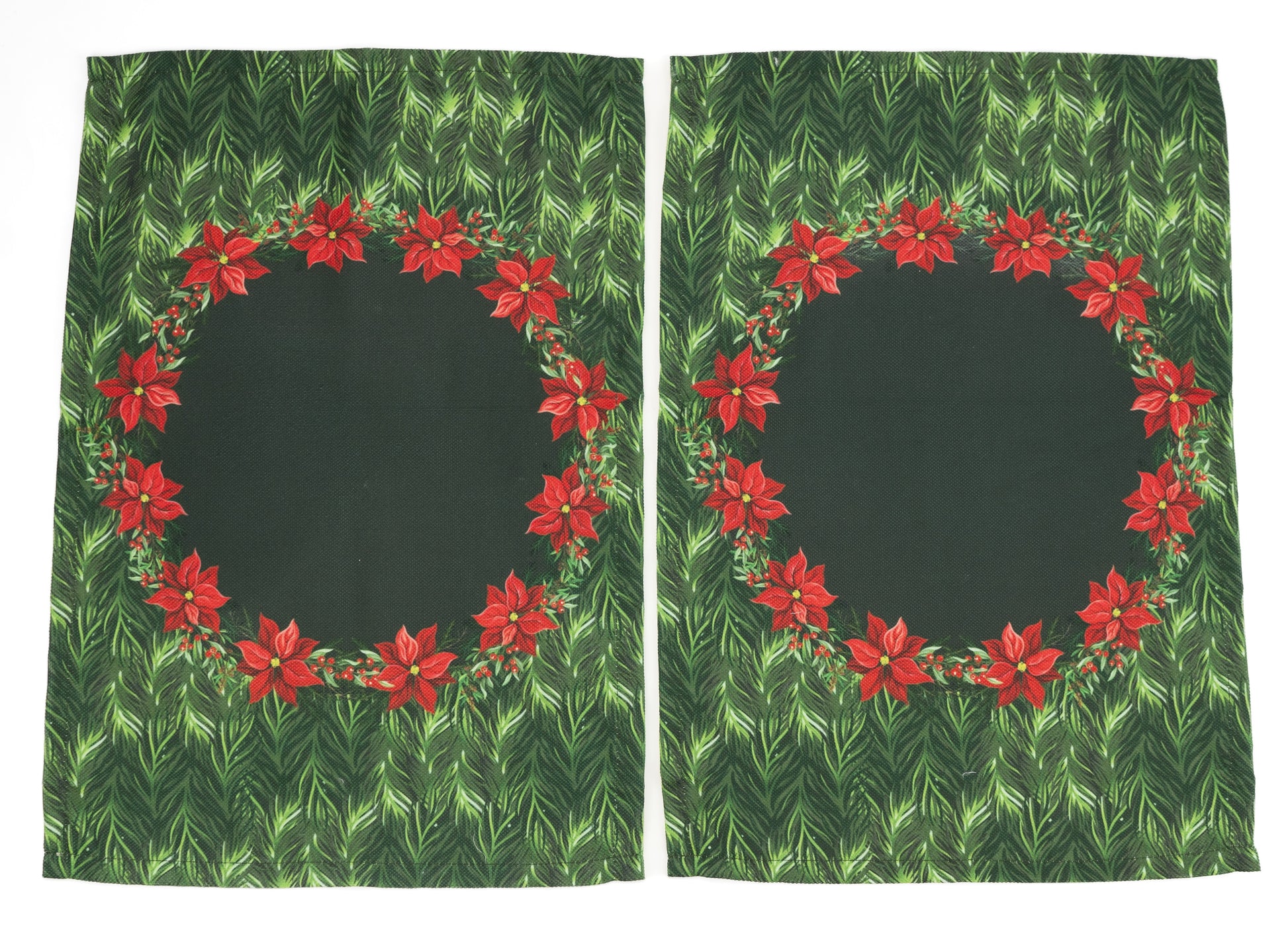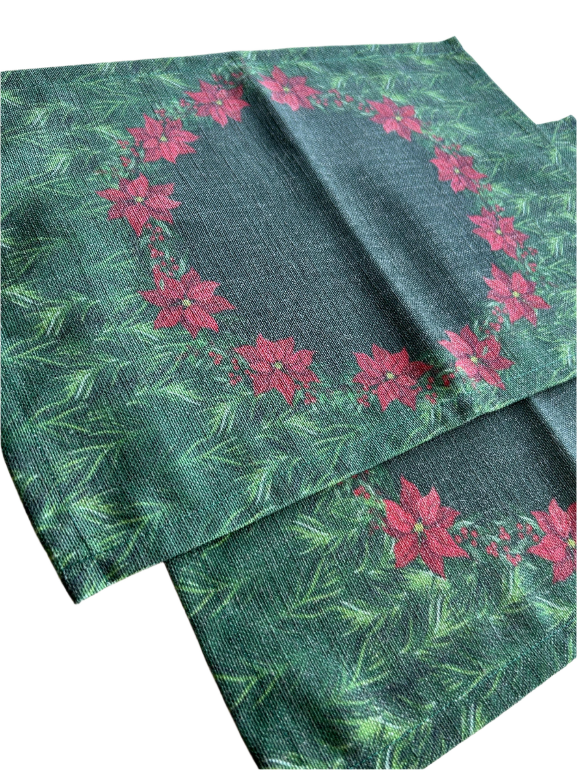 Festive red poinsettias adorn this deeply pigmented green and red placemat set for two. You will be able to see the flower motif even after you set the table, as the poinsettias ring around your setting. Material has a burlap, rustic feel, sure to make any table look nice and cozy for the holidays. Perfect for holiday gifting!