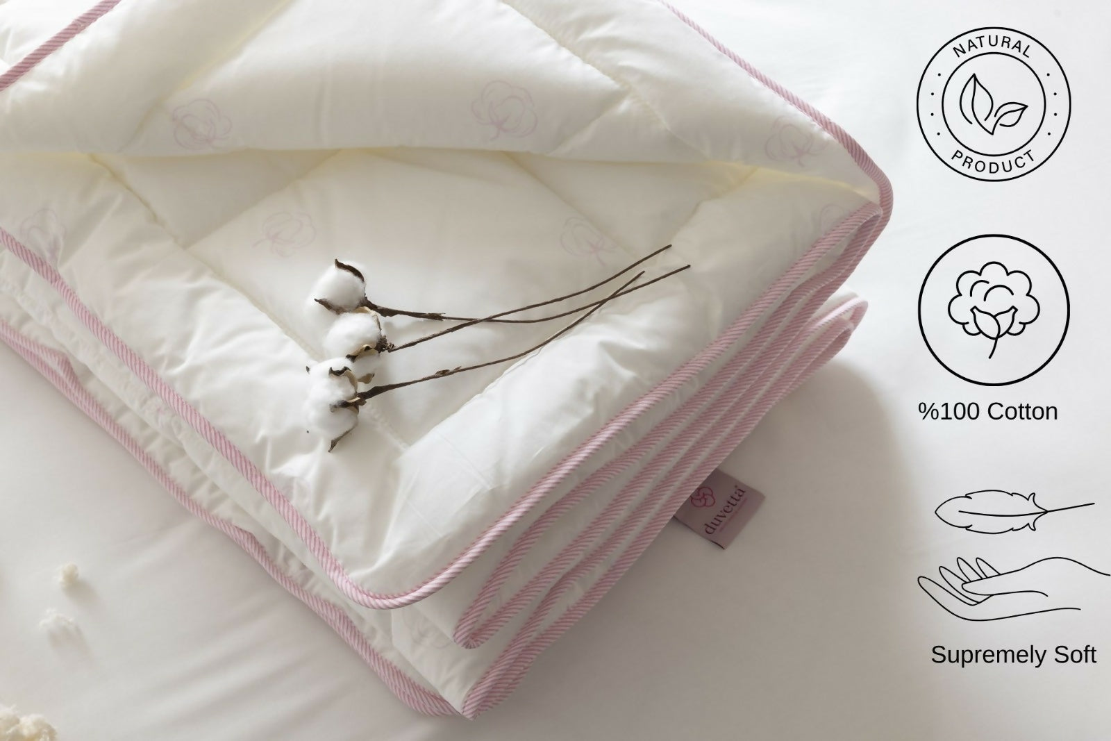 Enjoy a sound sleep with Duvetta's 100% natural cotton sleeping products Sleep peacefully and rested with the Duvetta’s hypoallergenic cotton comforter. This Premium Turkish Cotton duvet has a smooth cotton cover and regulates to your body’s temperature for maximum comfort. Natural cotton structure is a protective material against mold and mildew, and it cannot stay moist for a long time due to its moisture-wicking feature. Those with allergies can sleep better and more comfortably under it. Reasons to Use 100% natural cotton.