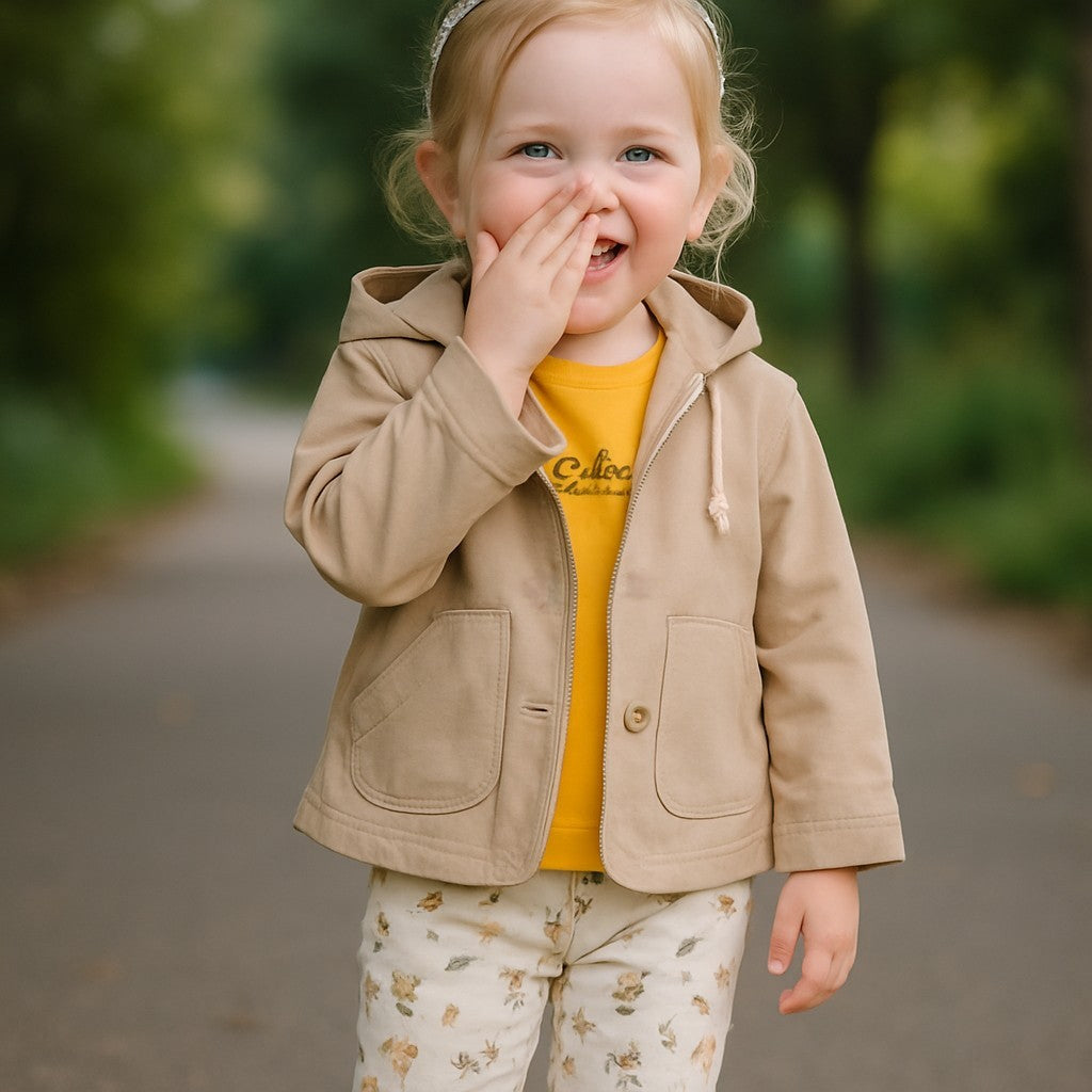 Cotton Jacket: is fully lined - including the hood! Generous front pockets for little hands, along with wooden-look buttons down the front and on the sides. Drawstring for the hood is for decoration only. Medium-weight jacket makes this outfit seamlessly transition her wardrobe from summer to fall and beyond.