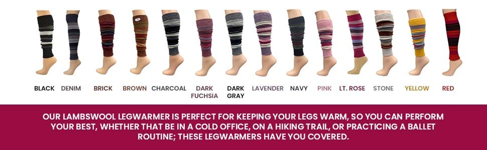 Our Lambs Wool Legwarmer is perfect for keeping your legs warm, so you can perform your best, whether that be in a cold office, on a hiking trail, or practicing a ballet routine; these legwarmers have you covered. This striped design pairs well with leggings, boots, jeans, or skirts, and with so many colors to choose from, you can be functional and stylish.