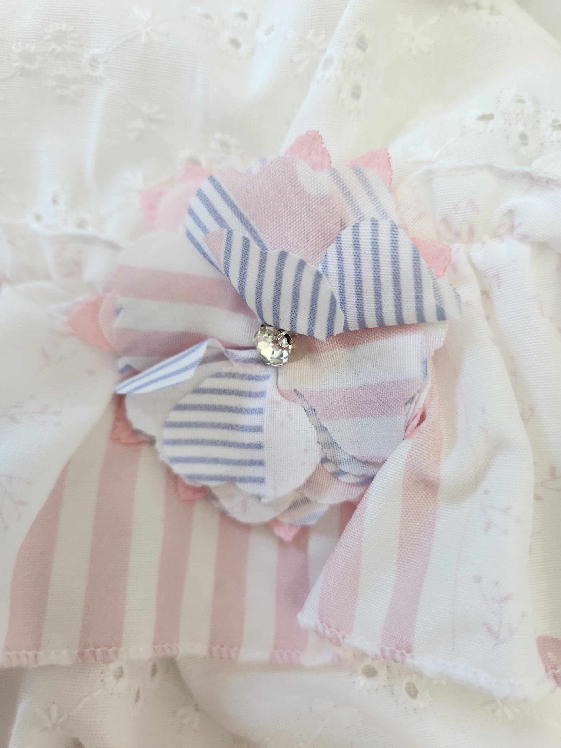 Romper: Features fully lined eyelet onesie with hues of plaid light blue and light pink with pink roses. Delicate rose in coordinating colors with clear accent stone is attached at the waist. Back zipper and snaps at bottom makes it easy to dress your little one. Flutter sleeves adds to the adorable look of this romper. Available in Pink. Made from 70% Cotton and 30% Polyester.