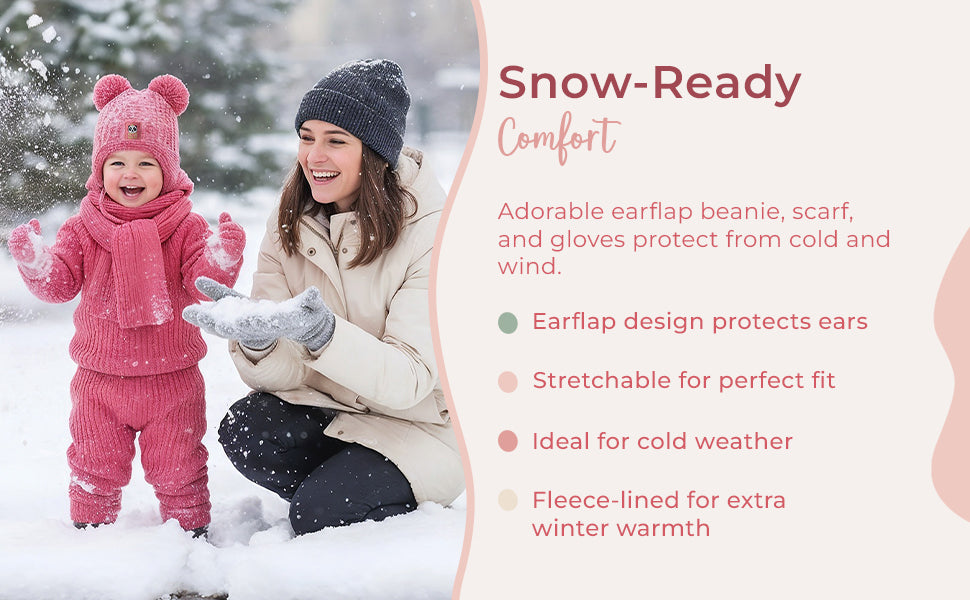 Toddler Knitted Winter Beanie 3 Piece Set With Earflaps For Girls