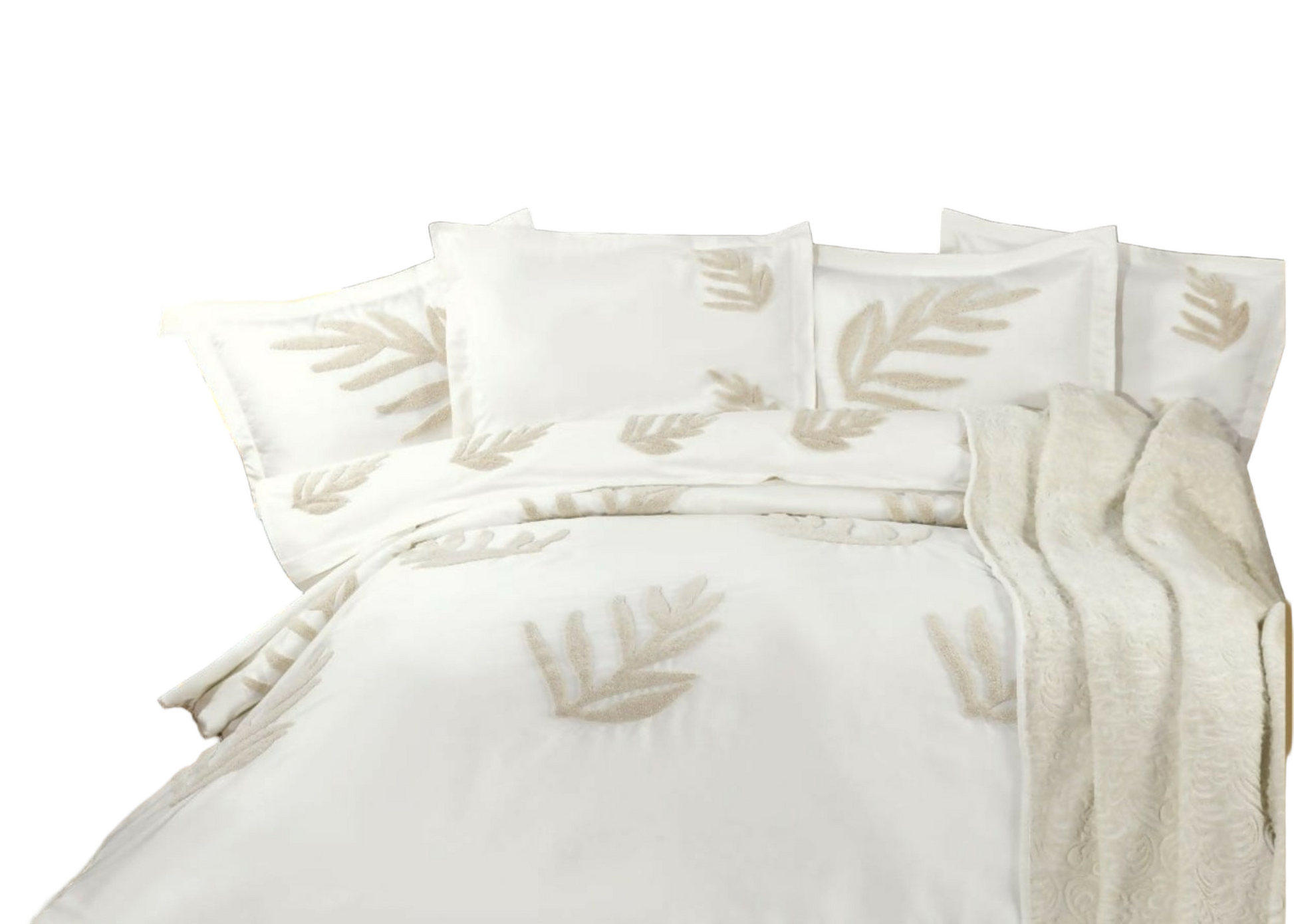 - Punch Needle Embroidery – Artisan-inspired raised stitching adds texture and elegance to the bedding