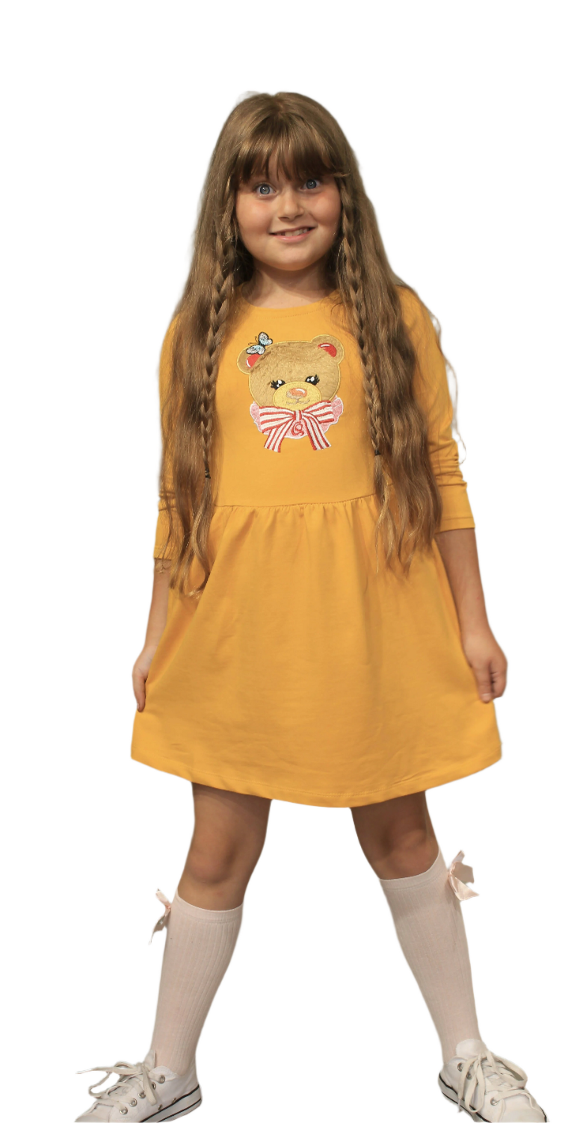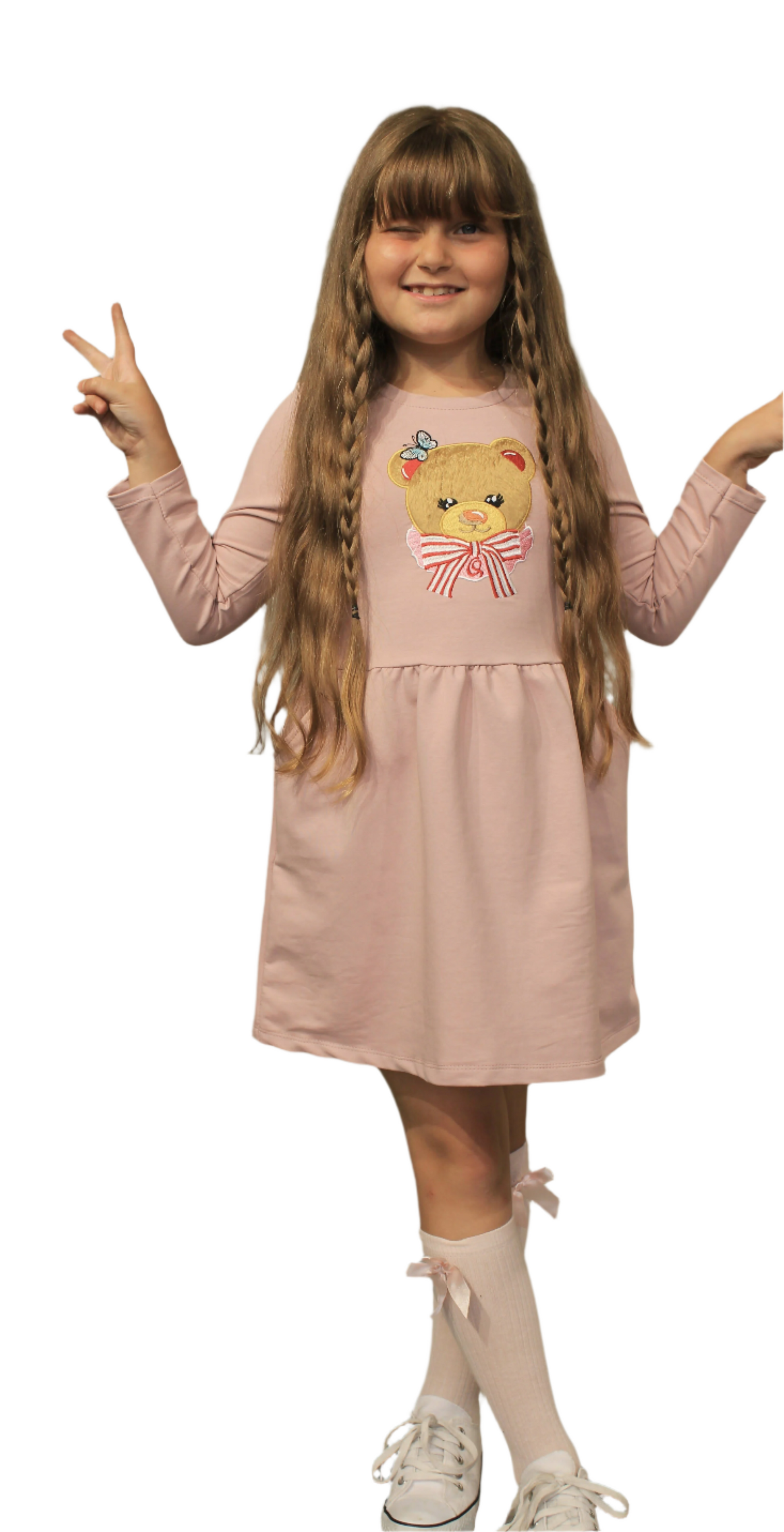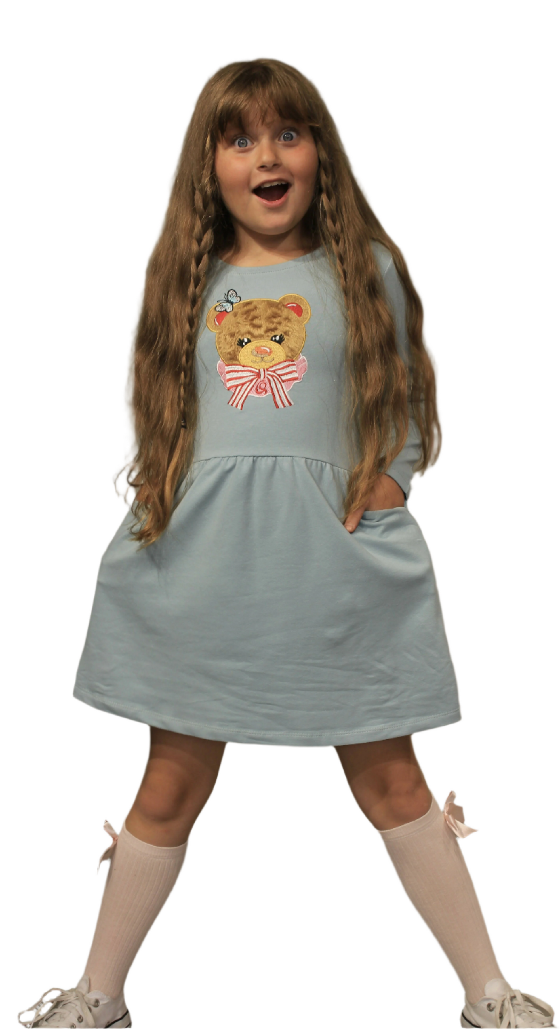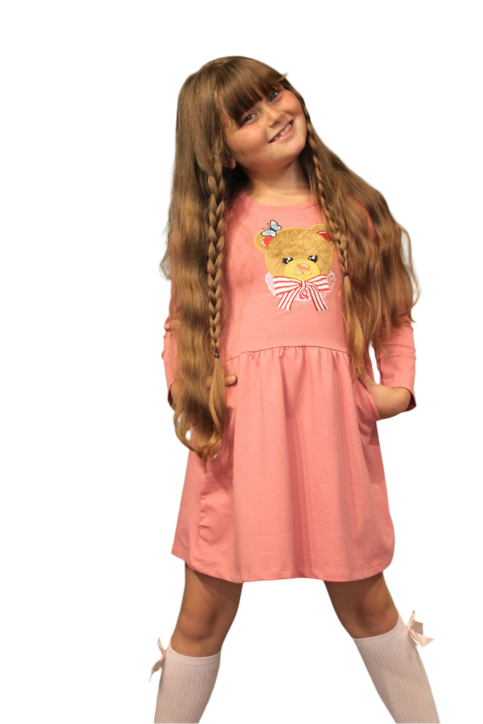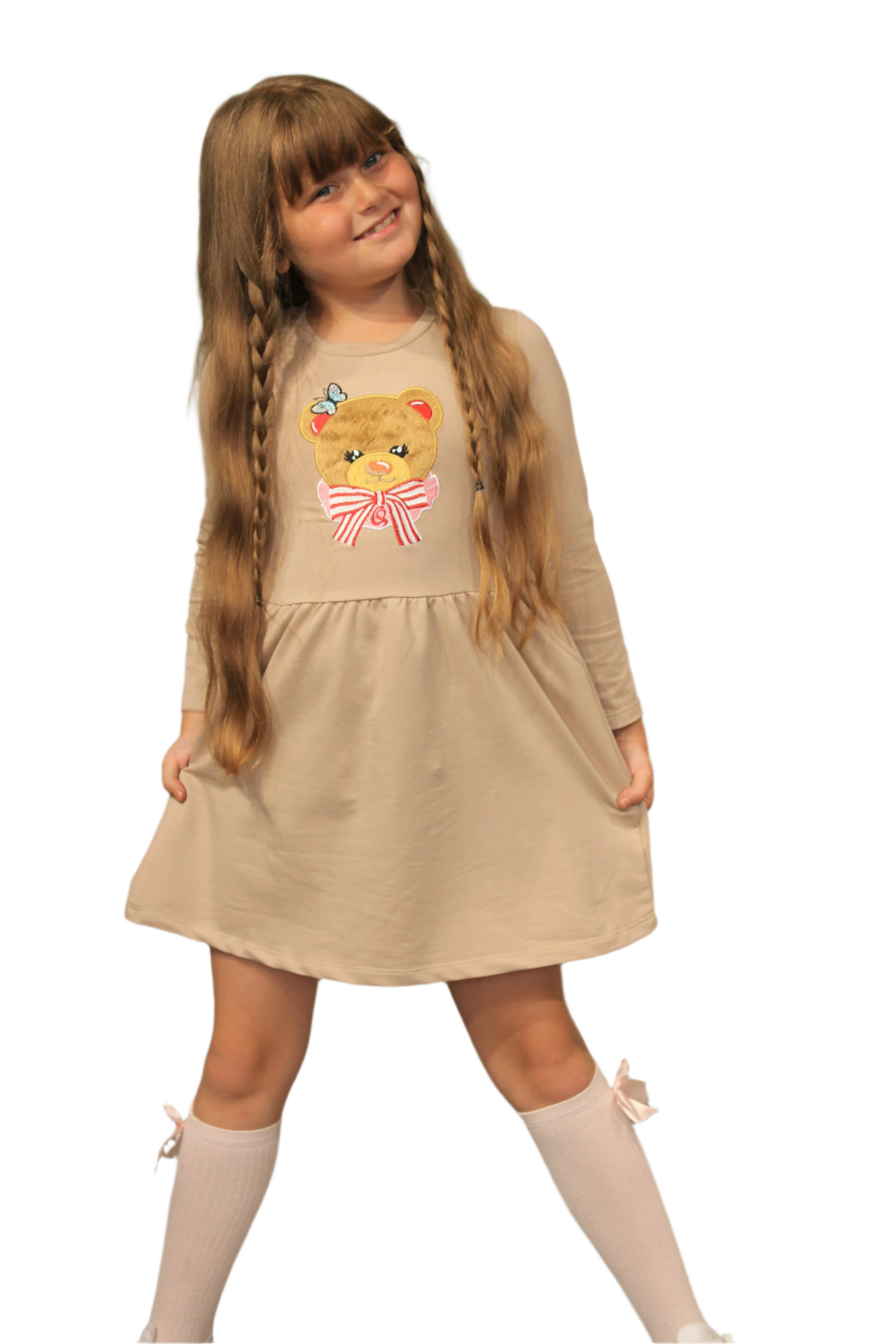 Long Sleeve Girl's Dress with Soft Fur Bear Applique - Dress with Pockets