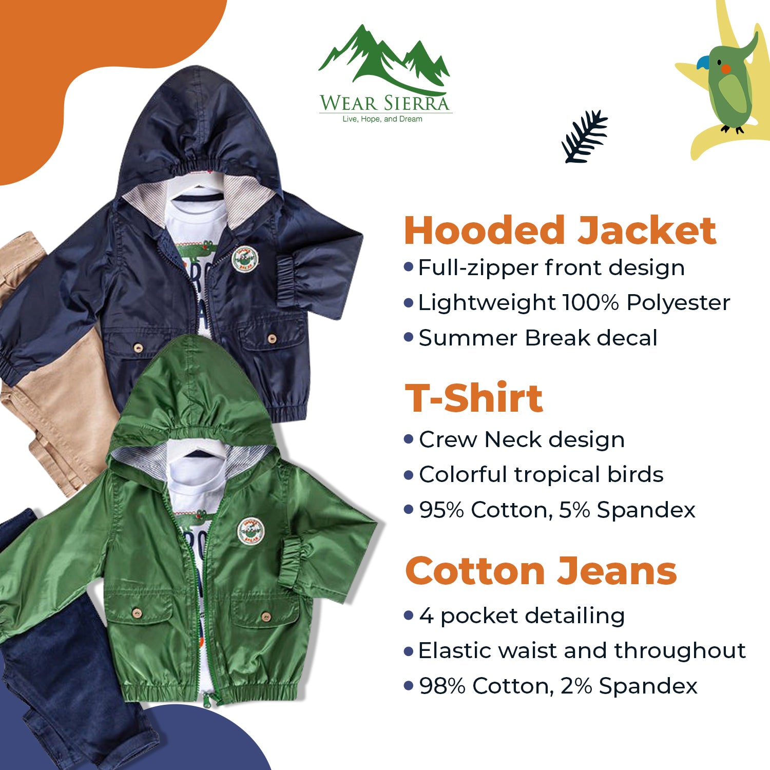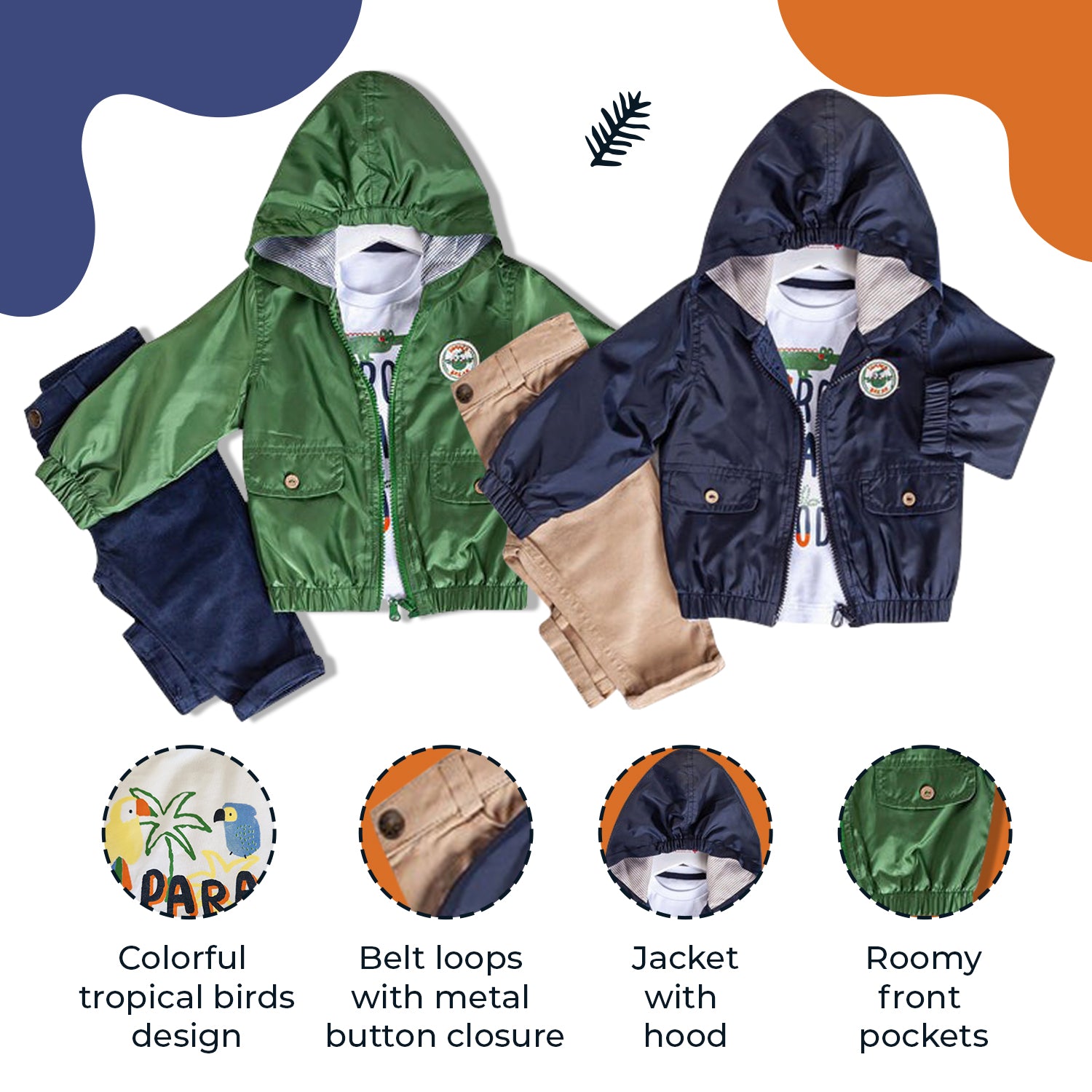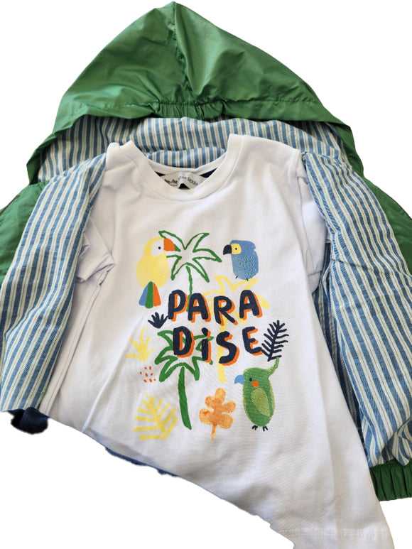 Hooded Jacket: Choose Navy or Green in a full-zipper front design jacket with hood. Interior is striped in complementary colors. Made from lightweight 100% Polyester to keep your little one dry all day. "Summer Break" decal with cute bird at left chest makes this outfit absolutely adorable.