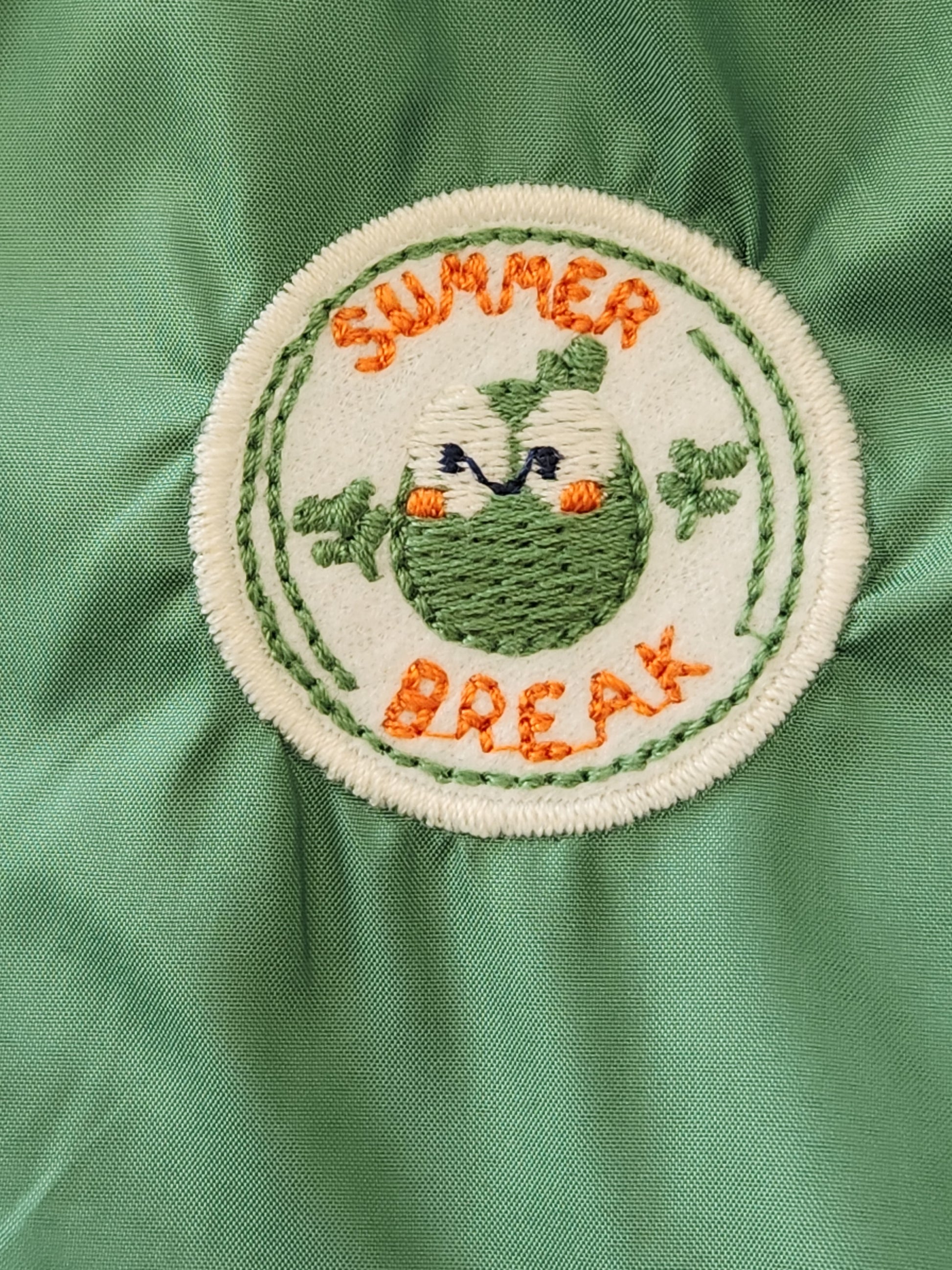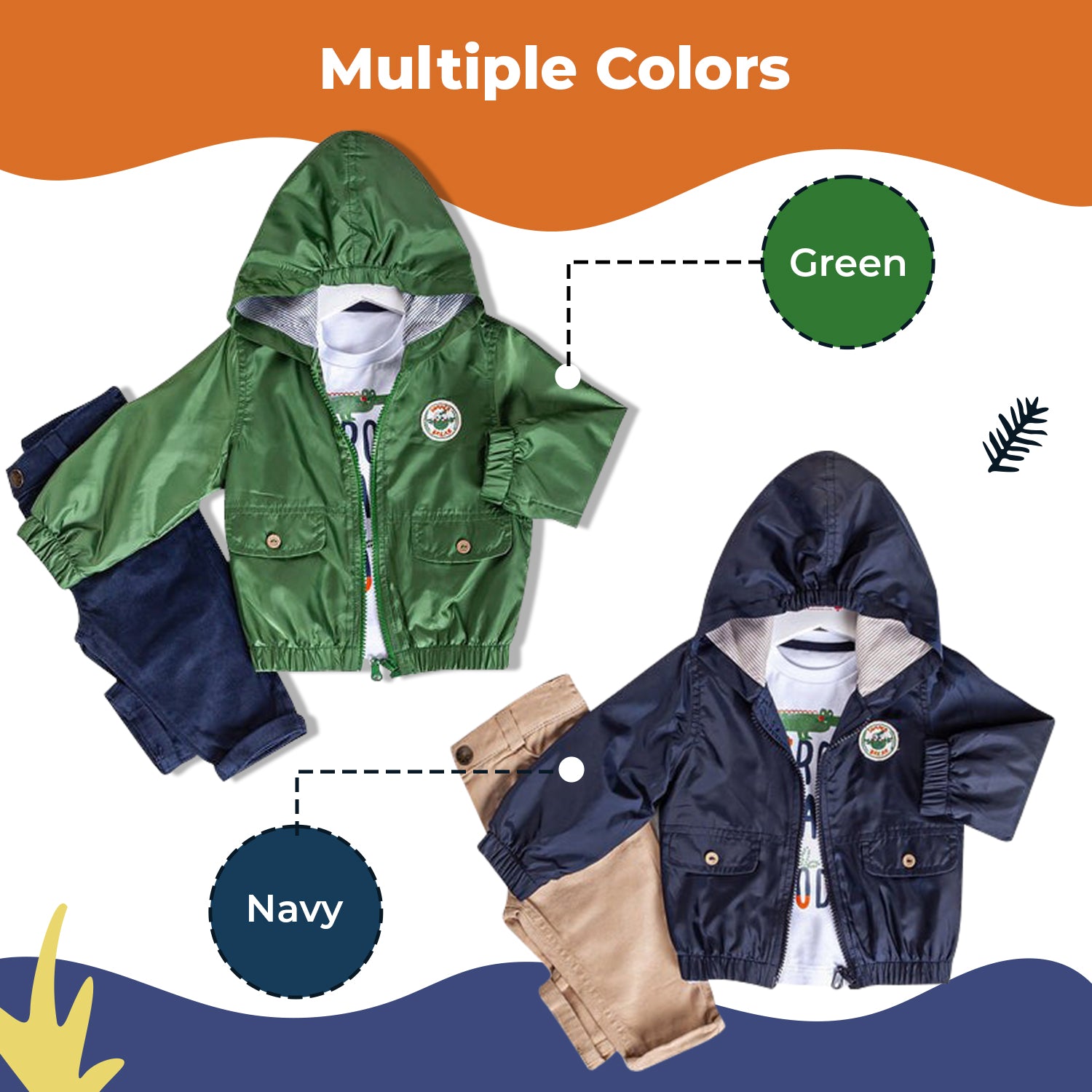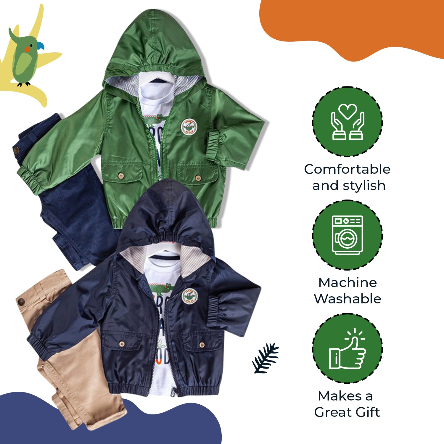 Hooded Jacket: Choose Navy or Green in a full-zipper front design jacket with hood. Interior is striped in complementary colors. Made from lightweight 100% Polyester to keep your little one dry all day. "Summer Break" decal with cute bird at left chest makes this outfit absolutely adorable.