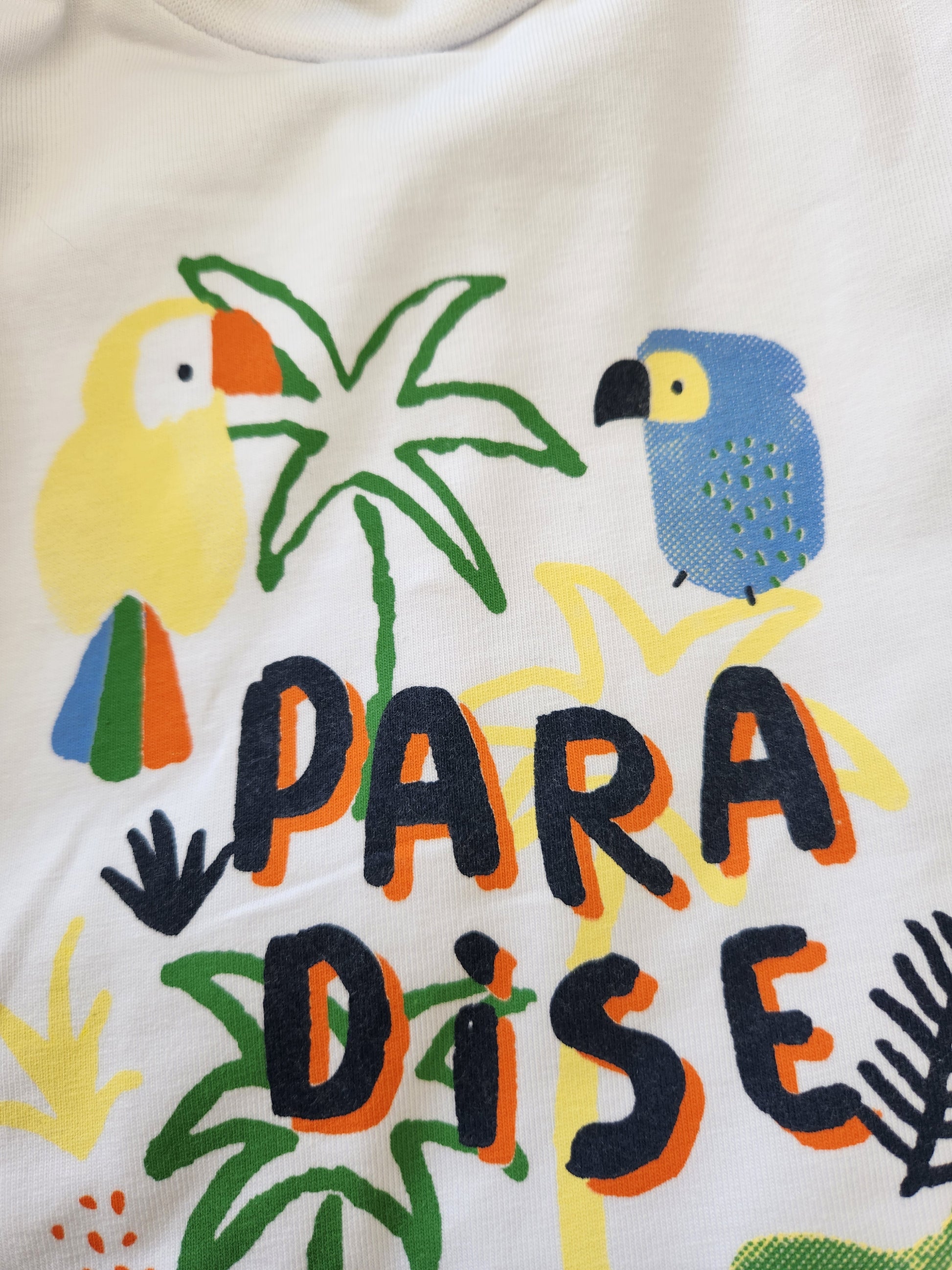 Short Sleeve T-Shirt: Printed Short Sleeve Crew Neck Cotton T-Shirt with colorful tropical birds and the word "Paradise" to brighten up any dreary day. In 95% Cotton, 5% Spandex for the perfect fit. T-shirt has shoulder snaps for ease of dressing.
