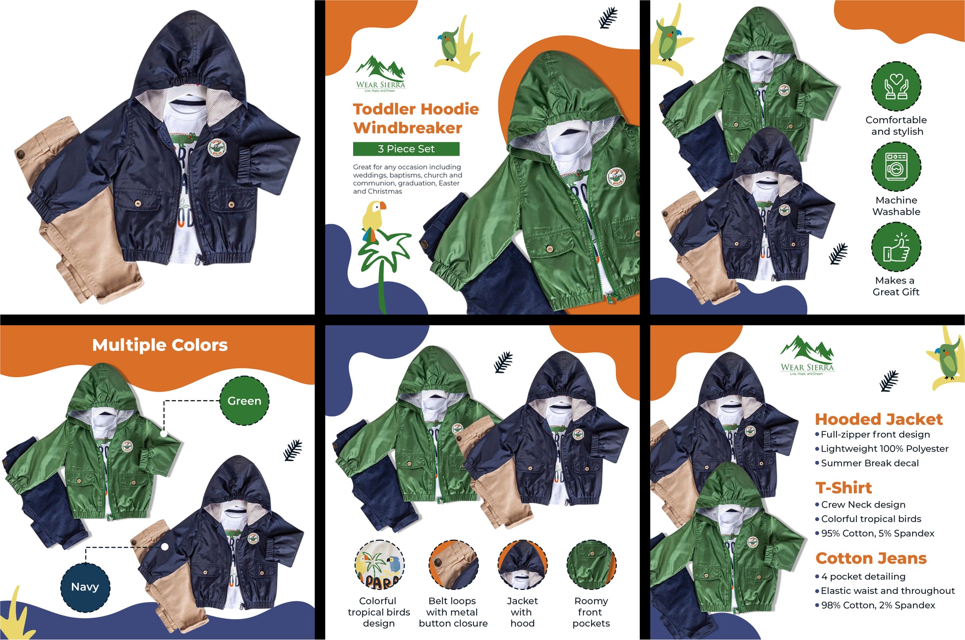 Our Infant & Toddler 3-Piece Set includes Infant Boys' Hooded Windbreaker Jacket, Short Sleeve T-Shirt, and Soft Brushed Cotton Jeans in easy to care for comfortable Cotton.