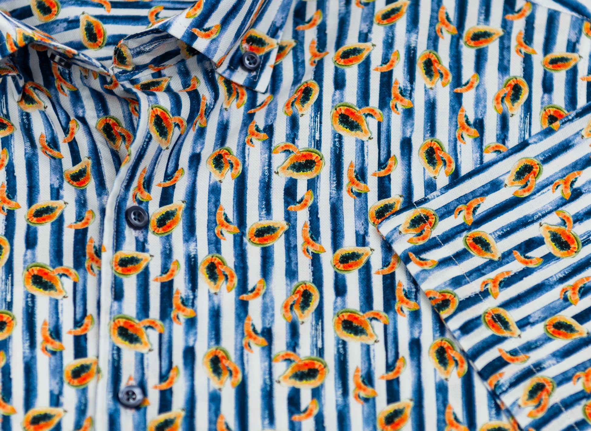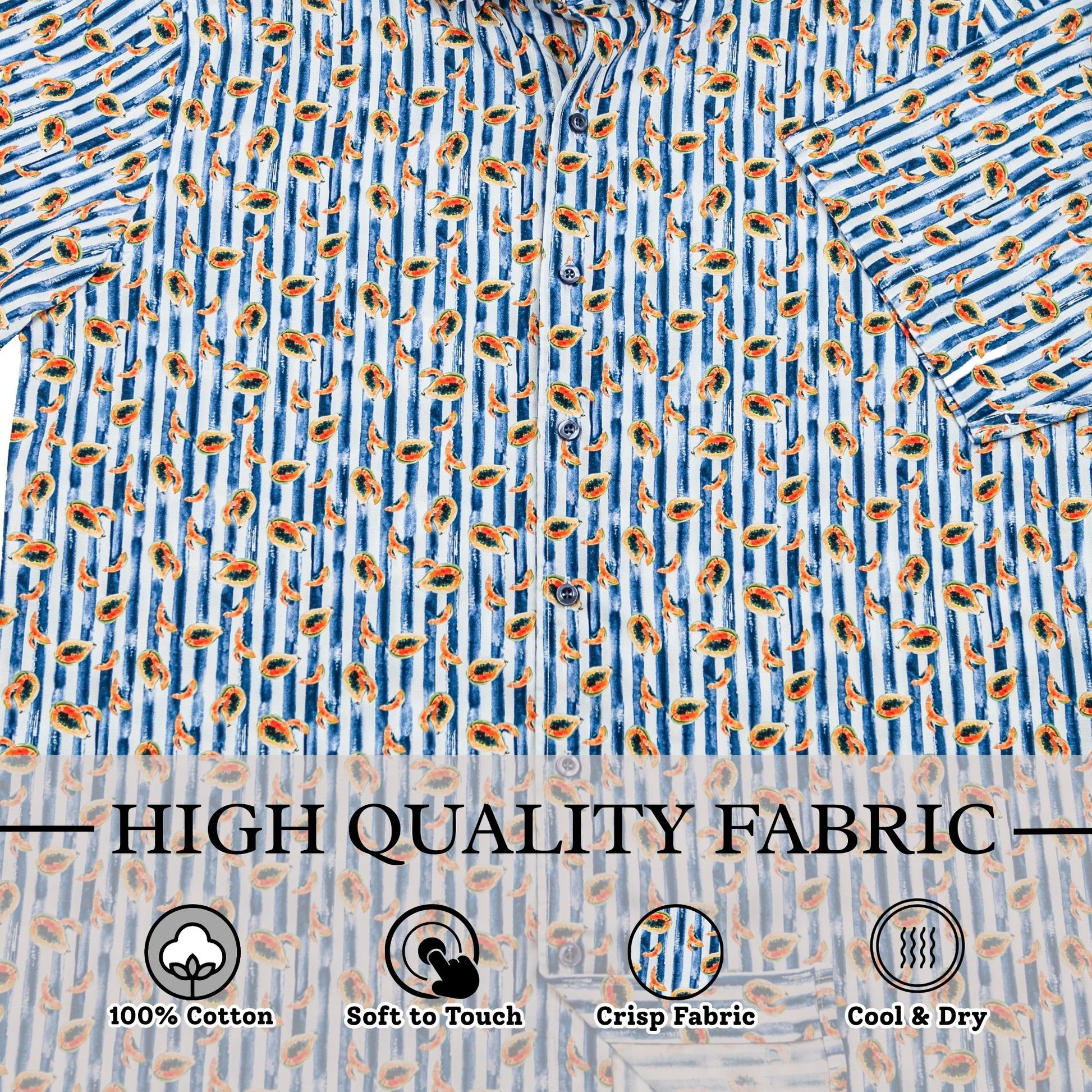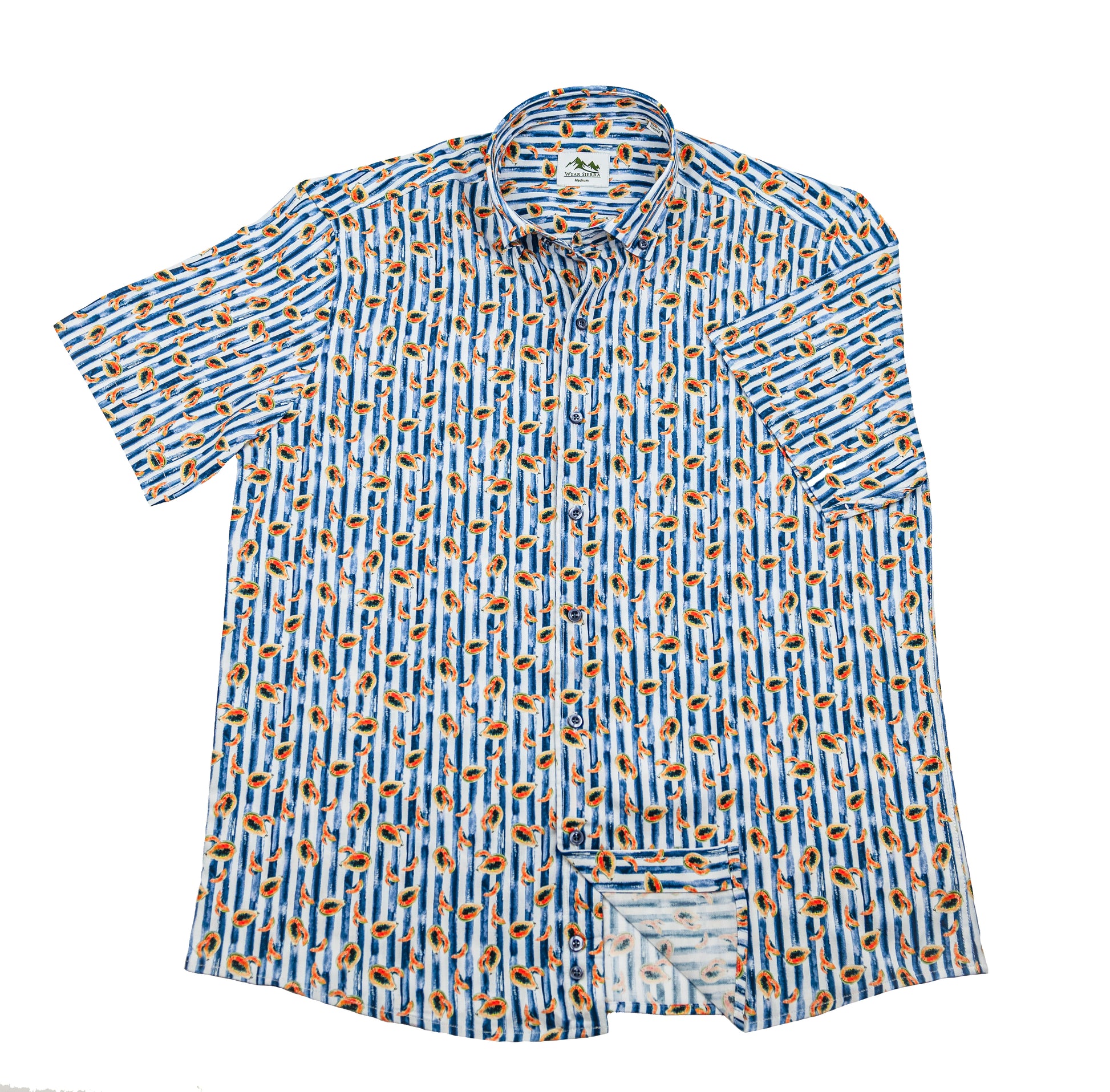 Wear Sierra Top Shelf Men's Cotton Short Sleeve Button Down Shirts in Navy Stripes & Papayas